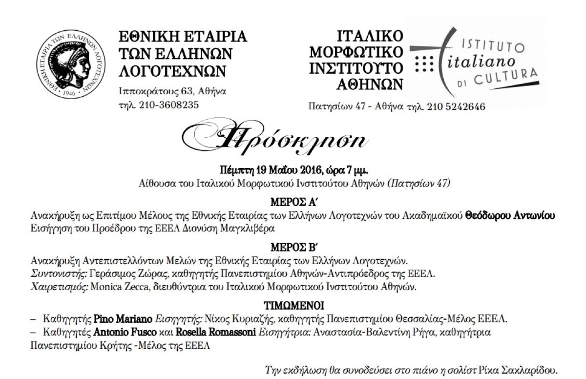 Η ΕΘΝΙΚΗ ΕΤΑΙΡΙΑ ΤΩΝ ΕΛΛΗΝΩΝ ΛΟΓΟΤΕΧΝΩΝ σε συνεργασία με το Σώμα των Ομοτίμων Καθηγητών του Πανεπιστημίου Αθηνών διοργανώνει την Τρίτη 29 Μαρτίου ώρα 7 μ.μ. στο Πανεπιστήμιο Αθηνών (Αμφιθέατρο Ιω. Δρακοπούλου) ειδική εκδήλωση με θέμα : ΕΠΙΣΤΗΜΟΝΕΣ ΛΟΓΟΤΕΧΝΕΣ
